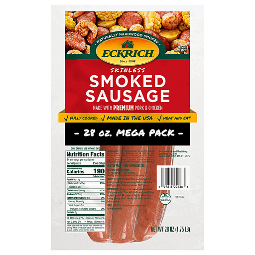 This naturally hardwood smoked sausage delivers authentic smokehouse flavor for a truly rich, savory taste the entire family will love. The precooked sausage can be sliced and served your way, which saves time in the kitchen. Cook Eckrich smoked sausage with onions and green peppers for a quick and easy supper, or mix it into mac n' cheese to add a delicious smoky flavor. Eckrich smoked sausage rope comes in a convenient easy-open package with a peel tab for quick access. This 28 oz family pack is perfect for larger gatherings.
