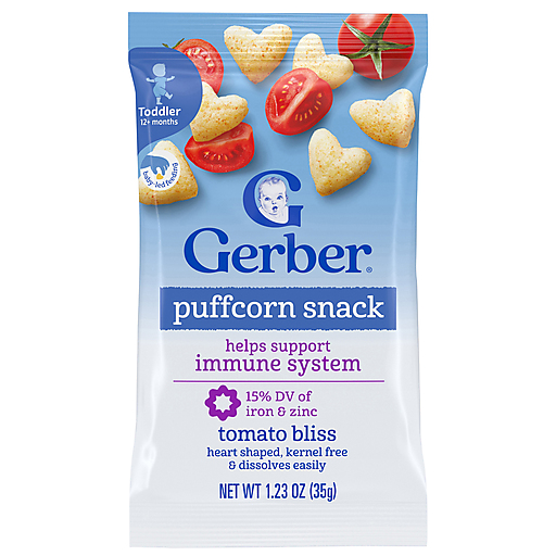 Gerber Tomato Bliss Heart Shaped Puffcorn Toddler Snacks are made with wholesome ingredients and strict quality standards. They are kernel free, dissolve easily and are perfect for little hands learning to pick things up, while also encouraging self-feeding. Specially crafted to delight your toddler, this puffcorn snack has iron and zinc to help ensure they get an adequate amount of these minerals to support the developing immune system. Gerber understands the importance of providing nutritious food as your baby grows and develops. Gerber’s dedication to quality and nutrition have always been our highest priority. We're committed to being your partner in parenthood with quality ingredients, nutritious food & expert guidance.
