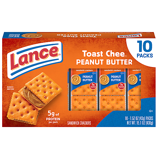 For more than 100 years, Lance has been fueling families with delicious snacks. One favorite is ToastChee Crackers, paired with our irresistible real creamy peanut butter filling. These are a truly iconic sandwich cracker snack! At Lance, sandwiches mean more: they aren’t just two somethings with whatever in the middle. ToastChee Peanut Butter Crackers are our fresh-baked crackers on the paired with real peanut butter filling to create a much-loved and tasty snack. Or, as we say, a Lance Sandwich cracker is two awesomes on the outside with totally incredible in the middle. You get 10 cracker snack packs with 6 sandwich crackers per pack. That means you can enjoy these convenient peanut butter and cracker creations during lunch breaks, for afternoon snacks, or snacking any other time - even on the go. The next time you’re ready to take a moment or need a quick pick-me-up, make it your one and only Lance Sandwich crackers, the king of all sandwich crackers. Bring it!