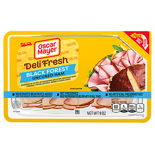 Make a delicious deli sandwich at home with Oscar Mayer Deli Fresh Black Forest Uncured Ham Contains Up To 24% Of Seasoning Solution, Natural Smoke Flavor Added, Browned with Caramel Color, Sliced Lunch Meat. Our quality Black Forest ham deli meat is 97% fat-free and made with no artificial preservatives*, no added hormones, and no added nitrates or nitrites, except those naturally occurring in cultured celery juice. Fully cooked and ready to eat, our uncured ham slices are seasoned with salt, garlic and other spices for an intense smoked flavor that's perfect for a sandwich, salad, or cheese and crackers. Keep our 9-ounce package of deli ham refrigerated to maintain freshness. If you enjoy our Black Forest deli ham, be sure to try the other varieties of Oscar Mayer ham lunch meat. *See Back Panel for ingredients to support quality.