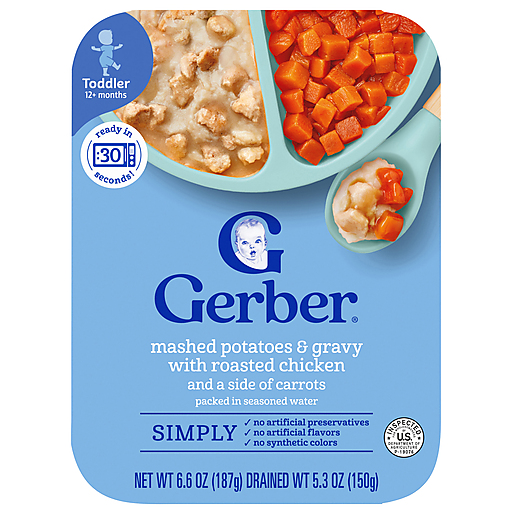 Gerber Lil Entrees Mashed Potatoes and Gravy with Roasted Chicken and Diced Carrots offer wholesome nutrition for toddlers with none of the hassle. A favorite comfort food meal, this dish includes chicken, mashed potatoes, gravy and carrots for delicious Gerber toddler meals with a full serving of veggies. Made with love and not preservatives, this toddler food is an excellent source of vitamin A and protein with 5 grams of protein per serving. Specially designed to meet your toddler's development needs, this Gerber baby food has a taste and texture toddlers love and encourages your little one to practice self-feeding. It's carefully cooked for just the right amount of time and sealed up tight in BPA-free packaging for convenient use with no need for refrigeration. Heat in the microwave for a quick meal or toddler snack. Cover and refrigerate after opening and discard unused portions after 2 days.