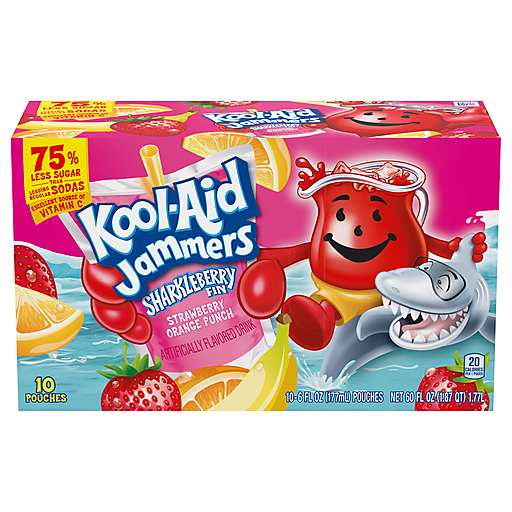 Kool-Aid Jammers Artificially Flavored Strawberry Orange Punch Drink Pouches deliver fun with a sweet blend of strawberry and orange flavors. Our delicious kids drink contains 75% less sugar than leading regular sodas (per 12 fl oz, this product 10g total sugar, leading regular sodas 40g total sugar), making it a great artificially fruit flavored drink for kids. Packed in a convenient drink pouch, kids can enjoy Kool-Aid at home, on the beach or during lunchtime. Each case of artificially flavored strawberry orange Kool Aid Jammers contains 10 pouches. Enjoy flavorful fun made easy. Available in a rainbow of flavors!