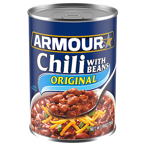 Armour Star Chili with Beans delivers a quick and easy canned food meal with great flavor. The canned meal offers a delicious chili recipe made with pork, beef and beans. This microwave chili is ideal for topping nachos, hot dogs, rice and more, or simply top it with grated cheese, chopped onions and sour cream for an easy meal. Heat the canned chili with beans on the stove top or in the microwave in 10 minutes or less. The can of chili is ideal for picnics, camping, road trips and more. Make any time Armour Star time.