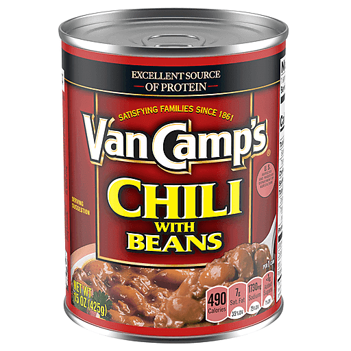VAN CAMP'S has been making delicious beans for more than 140 years. Pick up a versatile can of VAN CAMP'S Chili with Beans and be prepared to cook up a delicious dish or snack in minutes. A hearty helping of beef and pork are simmered in a special blend of beans, vine-ripened tomatoes and spices for a classic, Southern favorite. Use this can of chili with beans and ground beef in your favorite casserole, on top of hot dogs or baked potatoes or mixed into a dip to serve as an afternoon snack. VAN CAMP'S Chili With Beans is an excellent source of protein and made with all-natural* beef and pork with no preservatives. Quickly prepare by heating on the stovetop or microwaving for an easy weeknight dish.