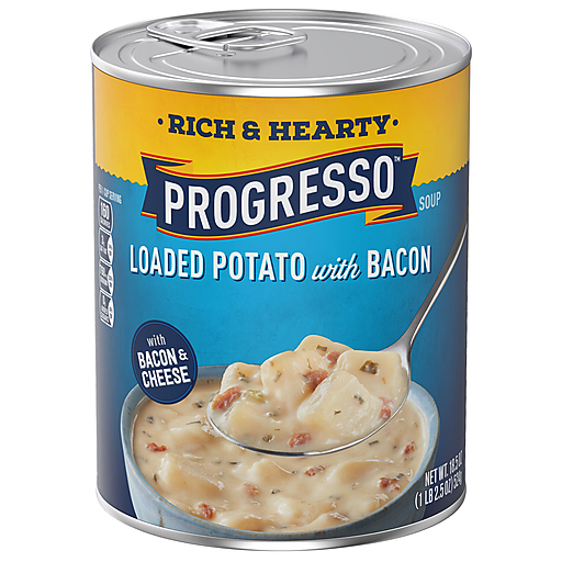 Load up your spoon with Progresso Rich & Hearty Loaded Potato with Bacon Soup and enjoy every delicious, wholesome bite. Made with no artificial flavors, artificial colors, trans fat or added MSG, you can indulge in this creamy potato, bacon and cheese soup whenever you like. This hearty, fill-me-up soup goes from can to bowl in less than five minutes. Serve it on its own or with freshly made bread for a quick and comforting meal. Have a can of loaded potato with bacon soup handy for days when you crave a trusted and easy meal option.