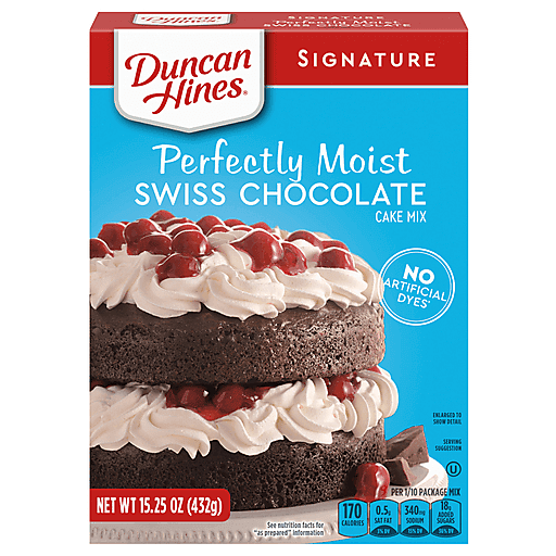 Duncan Hines Signature Perfectly Moist Swiss Chocolate Cake Mix makes a moist and delicious Swiss chocolate cake that is sure to become a family favorite. Made with rich cocoa, the smooth and velvety cake batter makes it easy to bake a perfectly moist cake every time. Simply add water, eggs and vegetable oil to the baking mix and stir to combine. Pour into a pan and bake for the recommended time in the instructions. Prepare this Swiss chocolate cake mix to make a simple Swiss roll, a decadent layer cake with cream cheese frosting or add sprinkles for a festive birthday cake. You can also use it as a cupcake mix, or to make fun cake creations like cake pops. This certified Kosher boxed cake mix makes two 8 or 9 inch round cakes, one 13 x 9 inch sheet cake or 24 cupcakes. From birthday cake to single serve desserts, Duncan Hines has you covered when you're ready to bake and create. Bake someone happy!