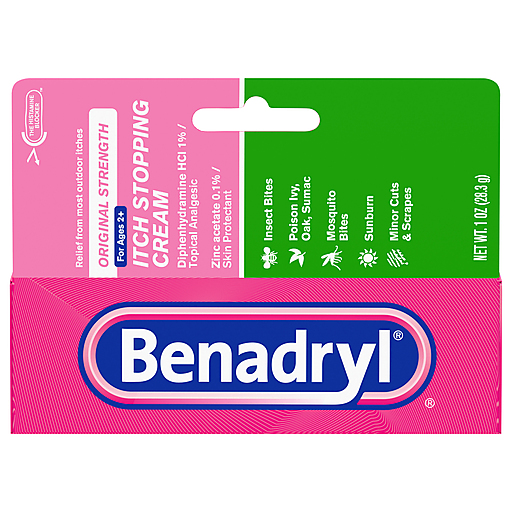 Get relief from minor pain and skin itching caused by most outdoor itches with Benadryl Original-Strength Itch Stopping Anti-Itch Cream. Made with 1% diphenhydramine hydrochloride, a topical analgesic pain reliever, and 0.1% zinc acetate skin protectant, this topical cream temporarily relieves itching associated with insect bites, minor burns, sunburn, minor skin irritations, minor cuts, scrapes and rashes due to poison ivy, poison oak and poison sumac. The soothing topical itch cream dries the oozing and weeping of poison ivy, poison oak, and poison sumac. Original Strength Benadryl Itch Stopping Topical Ointment is intended for ages two and up and is great to keep in your travel first aid kit or on hand during outdoor activities such as camping, hiking or taking a walk with the family. Adults and children two years and older, apply the itch stopping topical analgesic cream to affected area no more than three to four times daily.