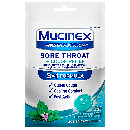 Mucinex 3 In 1 Formula Medicated Drops Alpine Herbs & Fresh Mint Flavor Sore Throat + Cough Relief 20 ea