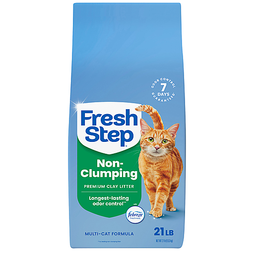 Fresh Step Non Clumping Cat Litter traps and eliminates unwanted litter box odors with premium clay and the fresh scent of Febreze. Featuring the longest-lasting odor control, this Fresh Step litter has a Superior Odor Control System that defeats litter box smells for 7 days (1). Natural, high-absorbing clay neutralizes and inhibits the growth of bacterial odors, while paw-activated Febreze freshness is released with each step your cat takes. This no clump, just dump litter keeps litter box maintenance easy and manageable, with no scooping required. Besides being an ideal cat and kitten litter, this Fresh Step Cat Litter non clumping formula is great for other uses around the house, like cleaning up oil and grease spots in the driveway, increasing traction on slippery roads and walkways, and freshening trash cans and diaper pails. Enjoy more catnaps and cuddle time with your kitty when you choose Fresh Step cat litter.
