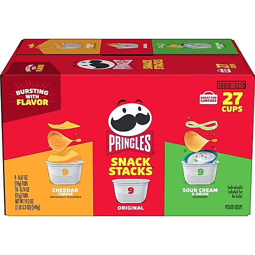 Enjoy the crisp, crunchy, hit-the-spot taste of potato and your choice of three delicious flavors. This variety pack includes single-serve cups of Original, Cheddar Cheese, and Sour Cream and Onion flavors. Insanely light, crispy and never greasy, they’re bursting with salty, savory flavor. These conveniently sized small cups make it easy to grab and go. Create snacking moments wherever and whenever; Grab a cup as a pick-me-up for after school or pack into school lunch boxes. Bring these portable snacks to game time and pack a few for other Pringles fans. Stash this anytime snack in your pantry or work desk to enjoy anytime. Share the variety pack at your next cookout or BBQ to turn up the flavor and fun among family and friends. Get your hands on Pringles potato crisps for enticing flavor options that keep you coming back, stack after stack.​