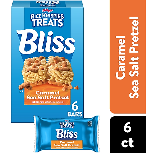 Take a bite of sweet, salty, crispy perfection. Enjoy timeless Rice Krispies Treats snacks now topped with candied sea salt pretzels and layered with caramel-flavored chips. You’ll love the delicious indulgence in Rice Krispies Treats Bliss Caramel Sea Salt Pretzel bars. They’re mouthwatering snacks perfect for both kids and adults with crunchy and chewy in perfect balance. From the tasty toppings to the layer of creamy caramel-flavored coating on the bottom, treasure every craveable bite when you need a just-for-you moment; It’s a 100 calorie bar made with no high fructose corn syrup, perfect for a lunch snack. These individually wrapped on the go snacks make it easy to satisfy cravings at work or whenever you need a decadent escape. Long day? Kick back and relax with an indulgent marshmallowy cereal bar. Enjoy as an afternoon snack, treat yourself to dessert, or share crispy, sweet and salty perfection as a party snack with friends. Pack your pantry with grab and go sweet snacks for hit-the-spot deliciousness. Savor the flavor and crunch of this sensational take on a classic treat.