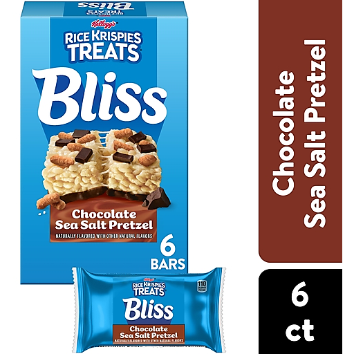 Take a bite of sweet, salty, crispy perfection. Enjoy timeless Rice Krispies Treats snacks now topped with candied sea salt pretzels, semi-sweet chocolate chunks, and layered on the bottom with smooth chocolate flavor. You’ll love the delicious indulgence in Rice Krispies Treats Bliss Chocolate Sea Salt Pretzel bars. They’re mouthwatering snacks perfect for both kids and adults with crunchy and chewy in perfect balance. From the tasty toppings to the layer of creamy chocolate-flavored coating on the bottom, treasure every craveable bite when you need a just-for-you moment; It’s a 110 calorie bar made with no high fructose corn syrup, perfect for a lunch snack. These individually wrapped on the go snacks make it easy to satisfy cravings at work or whenever you need a decadent escape. Long day? Kick back and relax with an indulgent marshmallowy cereal bar. Enjoy as an afternoon snack, treat yourself to dessert, or share crispy, sweet and salty perfection as a party snack with friends. Pack your pantry with grab and go sweet snacks for hit-the-spot deliciousness. Savor the flavor and crunch of this sensational take on a classic treat.
